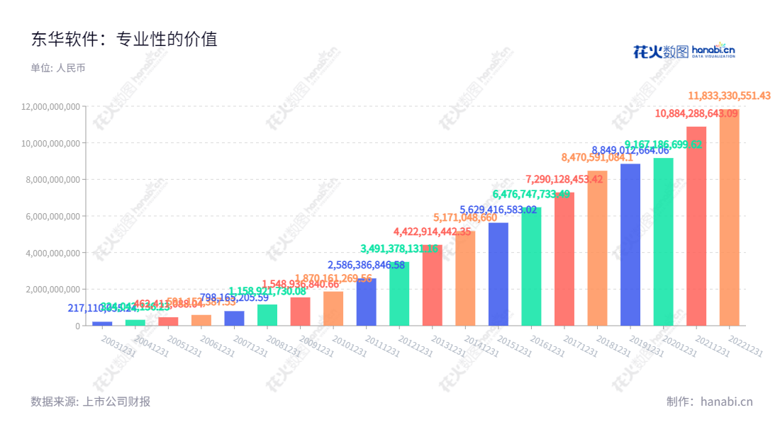 东华软件是一家致力于行业应用软件开发、计算机信息系统集成及相关服务业务的领先企业。凭借多年的行业经验及不断创新的专业服务,其业绩优异,收入增长稳步攀升,成为国内最受投资者喜爱视为的优质软件公司之一。从公司的收入报表来看,近几年来,东华软件的营收连续实现增长,2018年营收为84.71亿,较2017年增长了14.99%。至2020年,以来营收增长了$11.933bn,增长47.15%,这说明东华软件在当前已经建立了可持续发展模式。在产品及服务上,东华软件与中国电信、中国移动、阿里巴巴等行业巨头合作,为客户提供深度服务和增长支持,紧跟行业趋势,领先行业发展,卓有成效。东华软件致力于将创新和专业性作为竞争优势,在现有市场中占领一席之地,同时在不断扩大受众及缩小营销成本的同时,不断提供最新的解决方案给客户。东华软件的基础技术和经验都有助于其今后的发展。正如股份公司总经理吕波所说:“我们的目标是打造集行业专业性与商业价值为一体的创新性产品,持续为客户提供技术支持,并为行业环境提供最佳的解决方案。”如今,东华软件已经从一家小型软件公司发展成为行