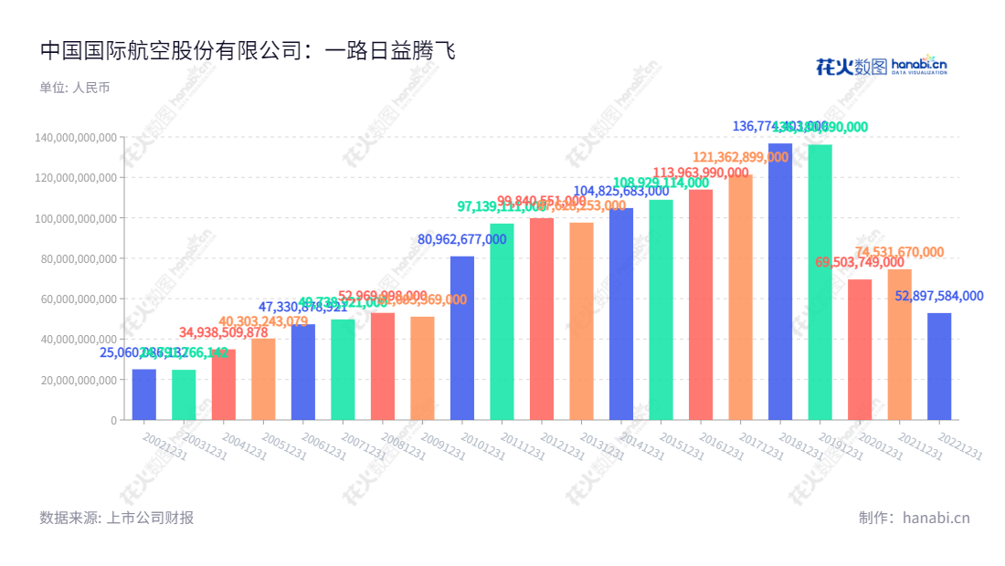 中国国际航空股份有限公司(Air China Limited),主营业务为定期、不定期航空客运和货运,是中国三大主要航空公司之一,也是中国最大的航空运营者之一。该公司拥有自1950年以来最为丰富的航空运营经验,拥有众多的技术、设备以及专业技术及管理人员,是航空系统整体改革的先行示范企业及标杆企业。根据从2022年到2013年几年里公司营业总收入的表格可以看出,中国国际航空股份有限公司的经营历程一直处于稳健的发展阶段,二十年内营业总收入从998.4亿元蹿升为5289.76亿元,增长超过5倍,充分展现出公司稳稳地在蓝图规划的轨道上运行,完成了传统业务的转型升级,有效把握市场的开拓机会,实现了良好的经营成绩。中国国际航空股份有限公司秉承“安全服务创新发展”的经营宗旨,将全面优化服务流程,不断提升服务质量,并且将不定期发行新技术的机票和新服务设施,不断晋升中国航空运输行业的水准。通过紧盯行业发展前景,凯旋蓝天,贯彻国家战略,全力提供优质运营服务,澎湃企业经济发展的热情,未来更将进一步把中国国际航空股份有限公司推向新的高度。