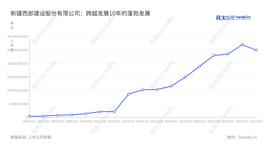 由建工集团作为主发起人,联合新疆八一钢铁集团有限责任公司(后更名为宝钢集团新疆八一钢铁有限公司)、新疆天山水泥股份有限公司、新疆公众信息产业股份有限公司、新疆新水股份有限公司(后更名为新疆新华水电投资股份有限公司)、新疆建筑科学研究院(后改制为新疆建筑科学研究院(有限责任公司))等五家发起人共同发起设立的新疆西部建设股份有限公司在2001年10月18日注册成立,近10年来成功开启了蓬勃发展的征程。新疆西部建设股份有限公司主要业务重点放在了高性能商品混凝土的生产和销售上,据公司发布的2012年至2022年间的营业总收入报表可以看出,公司在2012年里的营业总收入报表为2.118亿,到2018年均已飙升至18.849亿,2022年营业总收入报表为24.856亿。在这10年来,公司业绩实现了跨越式发展,可谓是实力超然。新疆西部建设股份有限公司秉承“安全、高效、环保、可持续”的理念,力求打造具有国际竞争力的企业经营平台,正着力构建管理、服务、质量和服务的卓越性,致力于增强企业核心竞争力,提升客户满意度,并取得了良好