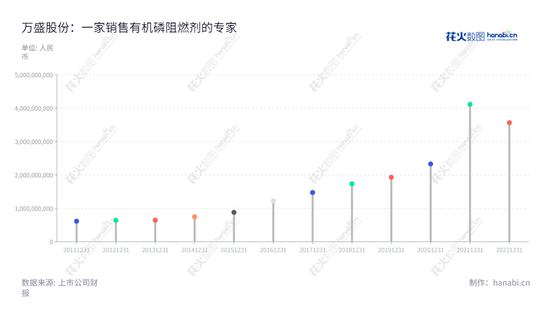 浙江万盛股份有限公司是一家位于台州市的研发、生产和销售有机磷系阻燃剂的专家。该公司于2010年11月成立,其董事长为朱平,高献国,总经理为周三昌,注册资本金额为6170万元。从报表日期可以看出,浙江万盛股份在过去的八年中取得了非常可观的发展,从2012年的641130949.27元上涨到2022年的3564211233.10元,其收入增长幅度令人印象深刻。在这八年里,销售有机磷系阻燃剂的业务也取得了骄人的成就,其业绩不断提升。自公司成立以来,浙江万盛股份公司相继在行业内获得了“洁净环保”、“精益创新”、“全面质量”等诸多荣誉称号,深受阿里巴巴、国美、大学生创业等企业的青睐。公司实行“采矿、销售一条龙服务”的经营理念,拒绝产品劣质贩卖,安详的管理氛围,诚恳完美的服务,都是浙江万盛股份公司与众不同的原因之一。总而言之,浙江万盛股份从一家初创企业发展到如今成熟的专业企业,均可以肯定地说万盛股份具有良好的发展前景。公司可持续发展的实践表明,浙江万盛股份将在未来继续保持锐意进取,为客户提供优质的产品和服务,为国家的振兴和发展做出更大的贡献。