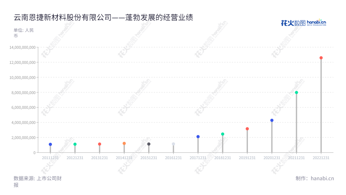 云南恩捷新材料股份有限公司是一家以膜类产品、包装印刷产品、纸制品包装为主营业务的制造销售企业,其董事长Paul Xiaoming Lee和总经理李晓华所掌控的公司,在近几年的蓬勃发展过程中,突破800亿元营业总收入的里程碑,这一可观的经营业绩有力地表明了该公司的发展能力和高质量的产品质量。从2013年至今,云南恩捷新材料股份有限公司的营业总收入,由11.07亿元左右,一路向上增长,在2019年突破至315.96亿元,然后在2020年有效率的拓展到428.30亿元,之后在2021年再一次创造新高变为798.24亿元,继而在2022年再次突破1000亿元营收,达到1.26亿元。这一汹涌的经营业绩,为云南恩捷新材料股份有限公司创造了历史性的奠基,彰显了该公司旺盛的创新能力和活力,也彰显了公司前景十分广阔的持续发展和稳健增长的能力。总之,云南恩捷新材料股份有限公司主营业务是膜类产品、包装印刷产品、纸制品包装,近几年的营收趋势持续上升,造就了高达1.26亿元的历史性营业总收入,更是云南恩捷新材料股份有限公司蓬勃发展的最强音。希望在未来,本公司能够继续保持良好的发展趋势,以期能够