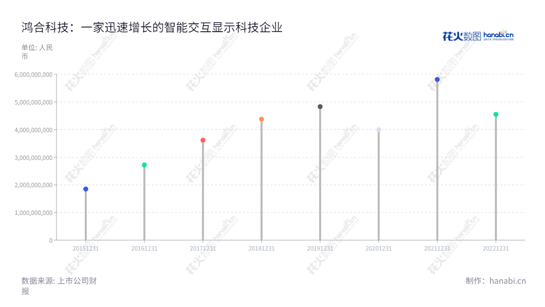 鸿合科技股份有限公司是一家致力于智能交互显示产品和智能视听解决方案的设计、研发、生产与销售的企业,位于广东深圳市,由邢修青担任董事长,孙晓蔷担任总经理。从总营业收入报表可以看出,从2015年到2022年,鸿合科技已经连续八年实现经营收入增长,引人注目的是,在2019年与2020快速增长,收入翻番,增长之快可见一斑。同时,该公司也以创新技术和强大的研发团队为依托,推出了一系列的智能交互显示产品和智能视觉解决方案,满足客户对先进的技术应用的需求。总而言之,鸿合科技在技术创新和经营方面做出了非凡的贡献,今后的发展前景令人振奋。我期待着这家坐落在深圳的智能交互显示企业能够取得更大的成功!