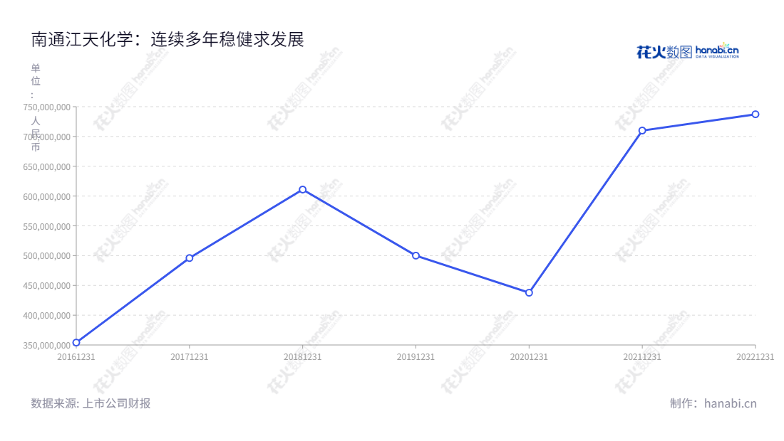 南通江天化学股份有限公司(以下简称江天化学)主营业务为以甲醇下游深加工为产业链的高端专用精细化学品的研发、生产和销售,该公司位于江苏南通市,董事长为朱辉,总经理为朱辉。据财务报表显示,江天化学近年来展现出显著的发展趋势。过去五年,江天化学的营业总收入稳步增长,从2016年的353995713.09元增至2022年的737294989.08元,增幅为109.31%,这表明公司正在以持续而稳健的方式求发展,而且未来发展空间还很大,前景可观。江天化学的领导团队和管理团队经验丰富,谋求可持续发展。他们不断探索新的发展模式,推进市场占有率的提高和从资本市场获取资金的实施,使公司保持稳定发展,同时履行社会责任,致力于改善环境和保护社会的发展。由此可见,江天化学不仅致力于改善现有业务,还注重推广新业务、拓展收入渠道,通过大力投资购买精细化、新型高端专用精细化学品,拓宽公司乙醇下游深加工业务,实施不断创新的发展战略,实现了稳定而连续的发展,不断提升企业的竞争力。江天化学致力于为客户提供更为优质的产品和服务,成功地满足了客