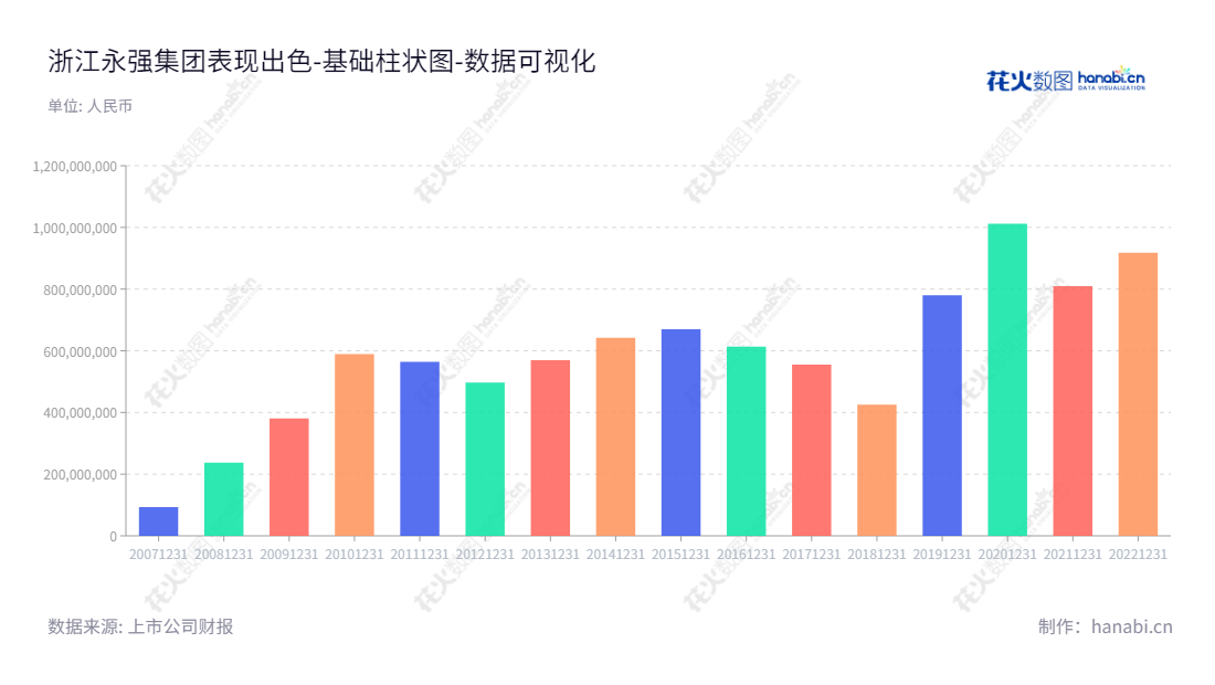 《浙江永强集团表现出色》浙江永强集团股份有限公司(Yotrio Group Co., Ltd.)创建于1985年,是一家专门从事户外休闲家具及用品设计研发、生产、销售的企业。它位于浙江台州市,董事长为谢建勇,总经理为谢建强。该公司从2013年开始,10年来的业绩表现出色:截至2022年12月31日,未分配利润总额为918080143.48元,比2013年增长了60.19%,比2014年增长了42.25%,比2018年增长了117.82%,比2021年增长了13.86%;2016至2022年,仅仅在6年时间就增加了2.76倍的利润,表明公司整体经营做得很不错。值得特别注意的是,该公司从2017年到2019年一直保持正增长,2021年未分配利润比2020年增长13.86,说明即使遇到了不利的疫情和受到一定影响,该公司的经营情况也表现出色,未分配利润继续增加,可见公司管理水平非常优秀。总之,近十年来,浙江永强集团股份有限公司在经营管理方面表现出色,在利润增长反映出可喜的成绩,是一家值得尊重的企业。