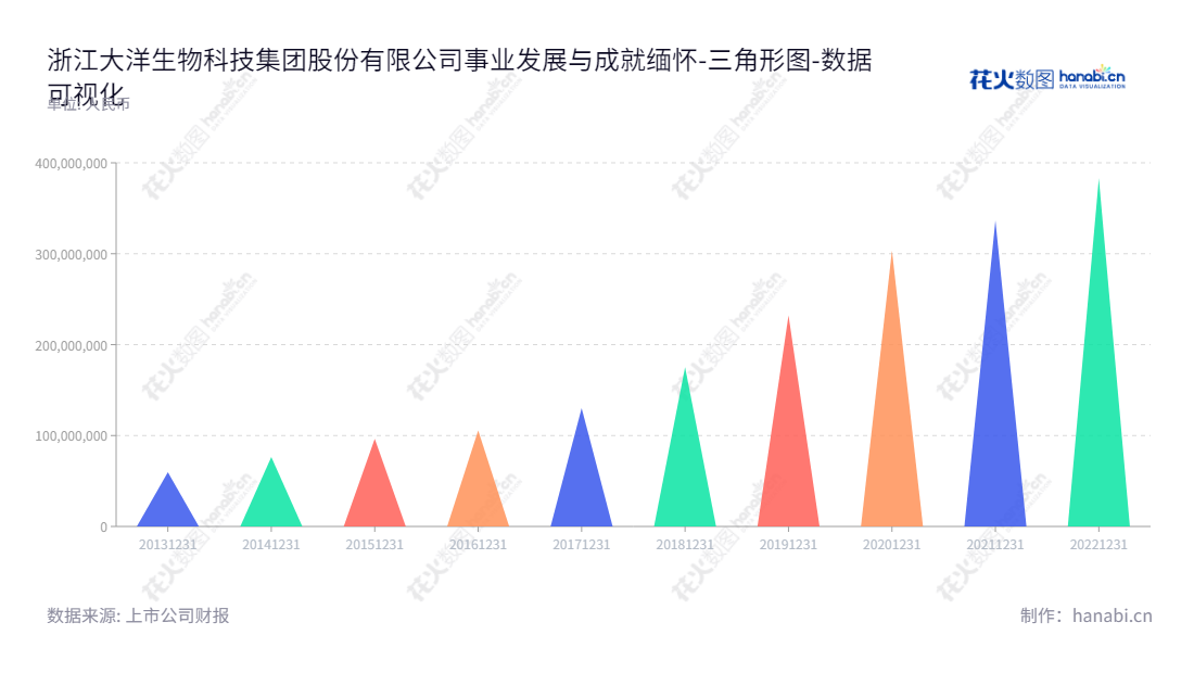 《浙江大洋生物科技集团股份有限公司事业发展与成就缅怀》浙江大洋生物科技集团股份有限公司(Zhejiang Dayang Biotech Group Co., Ltd.)位于浙江杭州,是一家生产和销售无机盐、兽用原料药等化学原料产品的公司。陈阳贵先生担任董事长、总经理,将这家公司经营的有序发展。该公司在管理方面表现出良好的业绩。从2013年到2022年未分配利润情况来看,未分配利润总额呈现逐年上升趋势,增长了6倍多,达到383116361.30元,收益稳步增长。此外,公司划定明确的利润分配原则,确保企业成功实现持续稳定发展,健康发展,大大提高了公司的可持续发展能力,获得了良好的业绩回报。公司一直以诚信可靠、标准合法的经营理念为宗旨,追求技术精湛、品质过硬、文化良好、效益高效的管理以及安全规范的产品。随着公司不断拓展市场,公司业务从满足本地需求发展到目前的跨省市及全国,并且建立了多个营销中心,形成了一条生产、销售、服务一体化的供应链,全面提高了服务质量,拓展国外市场,取得了突出的业绩。浙江大洋生物科技集团股份有限公司在经营活动的同时,一直积极履行社会责任,热心参与各种公益事业,为贫困地区地地补贴资金,