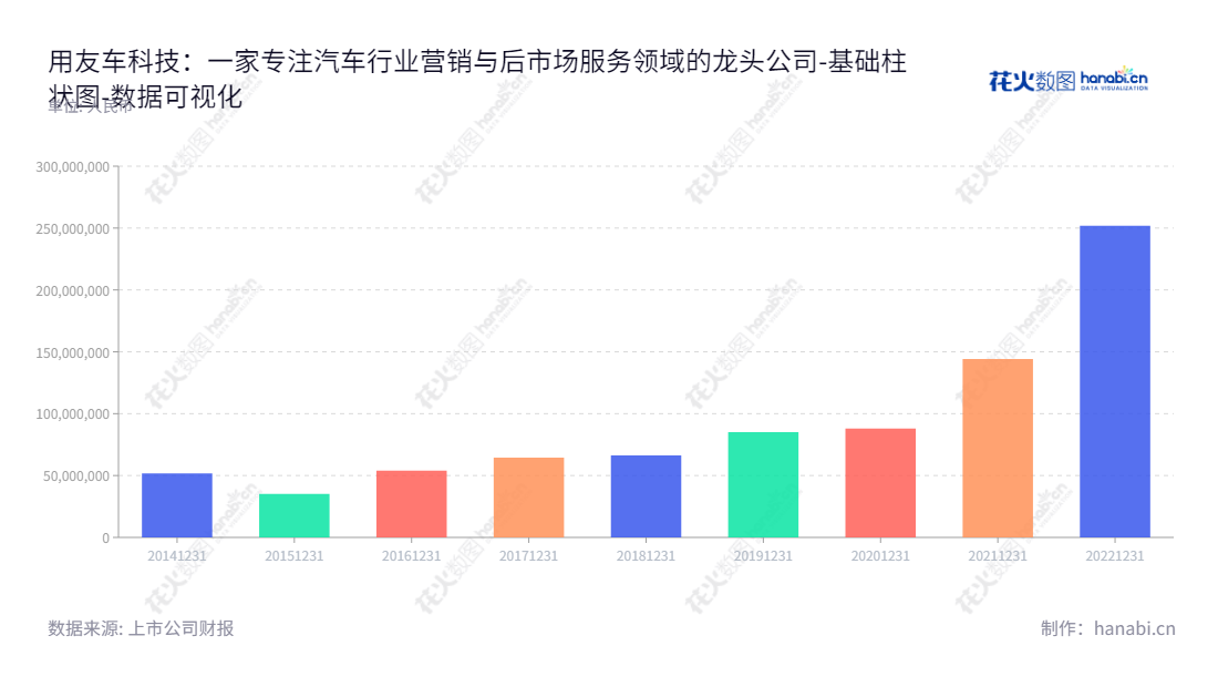 《用友车科技:一家专注汽车行业营销与后市场服务领域的龙头公司》用友车科技(688479)多年来专注于汽车行业营销与后市场服务领域,为客户提供相关软件产品及服务,经过多年的发展,其未分配利润一直保持稳步上升的状态。2014年的未分配利润为51762632.21元,2015年增长到35236132.58元,2016年至2021年均在百万元以上,2022年的未分配利润达到251935548.20元,有数十倍的增长,说明用友汽车信息科技(上海)股份有限公司在发展的道路上日趋势头企稳,并已经在汽车行业中占据了重要的地位,而这一切得益于董事长王文京先生和总经理桂昌厚的领导和管理,以及公司员工共同的努力付出。公司的稳定快速发展充分证明了用友车科技在汽车行业的龙头地位,希望未来可以持续取得良好的成绩。