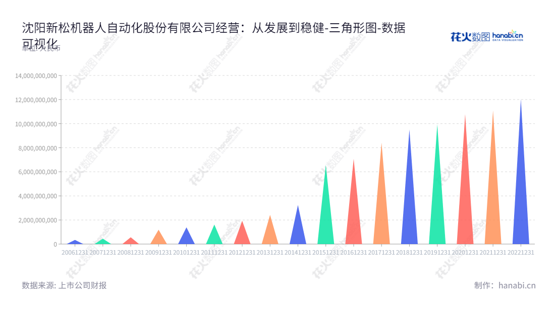 《沈阳新松机器人自动化股份有限公司经营:从发展到稳健》沈阳新松机器人自动化股份有限公司(简称沈阳新松)创立于2009年,自创立以来一路稳步发展,经过8年发展,已成为中国最大的机器人及数字化解决方案供应商。公司在智能制造、半导体装备、国防安全及消费服务领域提供智能化产品及服务。从资产总计报表来看,沈阳新松的资产从2012年的19.33亿元至2022年增长至12040.40亿元,在短短8年时间里取得了惊人的发展,凭借数字化解决方案以及智能制造和半导体装备技术的不断发展,沈阳新松取得了稳定的增长,其收入在过去8年稳步增长,现已实现由突飞猛进转向稳健发展。综上,沈阳新松机器人公司经过8年发展,已成为中国最大的机器人及数字化解决方案供应商,建立了完善的市场体系,增强了自身核心竞争力,使得叐收入在过去8年中取得稳步增长并实现从快速发展到稳定发展的转变。未来,沈阳新松机器人公司将会继续稳健发展,给全球智能制造业更多的活力。