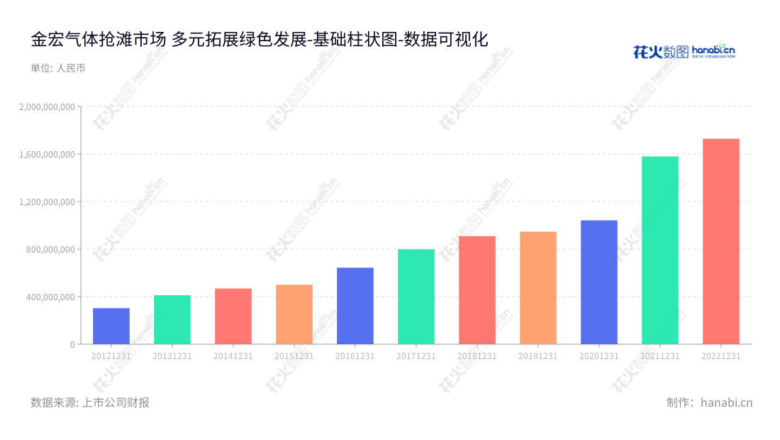《金宏气体抢滩市场 多元拓展绿色发展》 金宏气体股份有限公司(Jinhong Gas Co., Ltd.)是江苏苏州市的一家著名的环保企业,由金向华担任董事长和总经理,主要从事环保集约型综合气体研发、生产、销售和服务业务。公司有着丰富的经验,业务范围涵盖电力、冶金、医药、化工、制造业等多个领域,并历年取得辉煌的经营业绩。从2014年至2022年的营业总成本表来看,金宏气体在近9年来取得了长足的经营业绩,营业总成本逐年上升,其中,从2017年到2022年变化占比最大,说明公司在近几年增收不断,实现了快速发展。另外,在服务上,金宏气体积极拓展新能源应用,在电力建设、石油化工等行业迅速发展,推动环保行业的绿色发展。总之,金宏气体已经完成了从传统煤炭化工到新能源应用的转型,以及从低成本运营为基础,实施技术强、服务加强、客户体验提升的战略,帮助企业取得长足的发展,助力行业实现更为绿色可持续的发展。