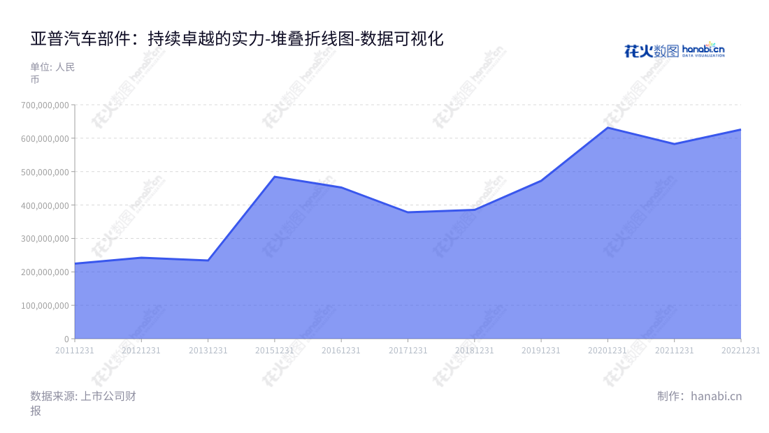 《亚普汽车部件:持续卓越的实力》亚普汽车部件股份有限公司(YAPP Automotive Systems Co., Ltd)拥有完善的经营基础,以及有深远影响力的团队领导力,总经理赵政及董事长姜林携手努力,将亚普汽车部件推广至全国各地。亚普汽车部件的主营业务是设计、开发、制造和销售汽车(主要是乘用车)燃油系统部件。从图表来看,从2011年到2022年,亚普汽车部件的营业利润有了长足的发展,营收不断提升。2022年的营收额高达625,989,583.40元,比2011年的224,796,241.98元有了近2.8倍的增长,说明行业的竞争力在不断加强,获得了持续的发展。在未来几年,随着亚普汽车部件不断增强的创新能力,有望继续延续其在汽车部件行业的50多年领先优势。总部位于江苏扬州的亚普汽车部件,更是开拓了汽车部件行业技术革新的里程碑,不断朝着全球汽车部件优化发展的方向前进。亚普汽车部件以得天独厚的技术创新能力及企业广泛支撑,充分满足国内外市场的需求,持续为汽车制造商提供高性能、高质量及高可靠性的汽车部件产品。总之,从营业利润和行业领先优势来看,亚普汽车部件彰显了其非凡的实力和可持续的发展势头,在汽车部件行业里将有更加
