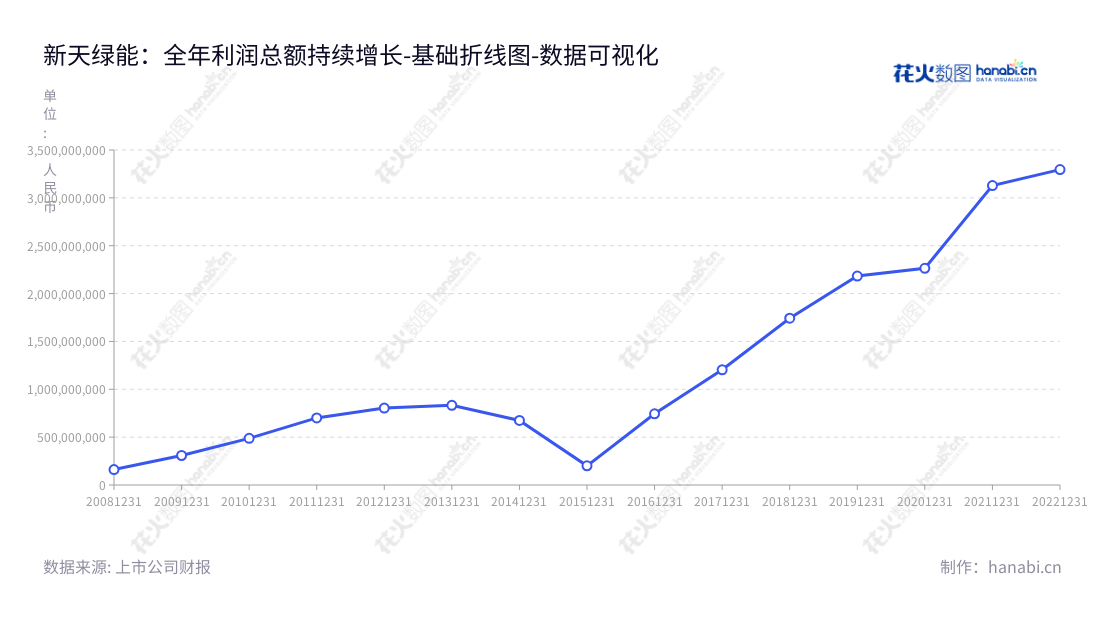 《新天绿能:全年利润总额持续增长》新天绿能(600956)是一家位于河北石家庄市主营天然气销售业务及风力发电业务的公司,创建于2013年,董事长为曹欣,总经理为梅春晓,网址为www.suntien.com。从公司利润总额的近几年情况来看,新天绿能获得了显著的发展。从2013年的832303886.52元,到2022年预计的3295069142.96元,公司利润总额一直在持续增加。有趣的是,自2017年以来,利润总额每年均保持持续增长的趋势,增速明显。从这些数据可以看出,新天绿能在积极应对市场变化、扩大市场空间、调整产品结构和不断完善企业内部制度等方面进行了大量的积极投资力度,取得了优异的经营成绩。新天绿能的发展速度令人印象深刻,展示出强大的执行力和运营能力。随着国家对清洁能源的更多鼓励政策的出台,新天绿能的业务规模将有更大规模的扩展,有望实现更大规模的发展。