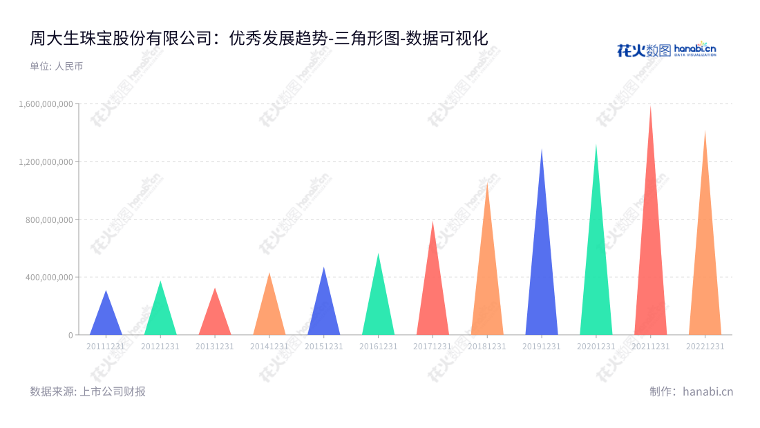 《周大生珠宝股份有限公司:优秀发展趋势》周大生珠宝股份有限公司(Chow Tai Seng Jewellery Co., Ltd.)成立于广东深圳,专事以“周大生”品牌珠宝首饰的设计、推广及连锁经营,董事长兼总经理周宗文。从上市到现在,该公司可谓借助其强大的专业技术,严格履行企业信誉义务,为客户提供特色服务,以及坚持把质量放在第一位,实现领先行业发展。可以说,公司的发展取得了很大的成就。从收入报表来看,近年来该公司的利润总额呈现出明显上升趋势,而其最终利润2015年达到4.72亿,2016年达到5.67亿,2017年达到7.91亿,2018年达到10.59亿,2019达到12.92亿,2020年达到13.24亿,2021年达到15.91亿,2022达到14.20亿,同比均有上涨,其经营状况显示出明显的上升态势,这些成果来自周大生珠宝股份有限公司对质量的坚持和企业信誉义务的努力。从上述数据可以看出,公司对于市场风险的及时应对、对于经营管理的创新,以及对自身品牌形象的持续把握,从而保证了企业的利润的增长,证明了该公司经营开展是优异的。总的来说,由于周大生珠宝股份有限公司凭借专业的技术支持,积极的经营管理以及对品牌的打造,其经营情况一路稳健上升,显示出良好的发展前景。